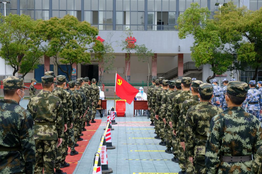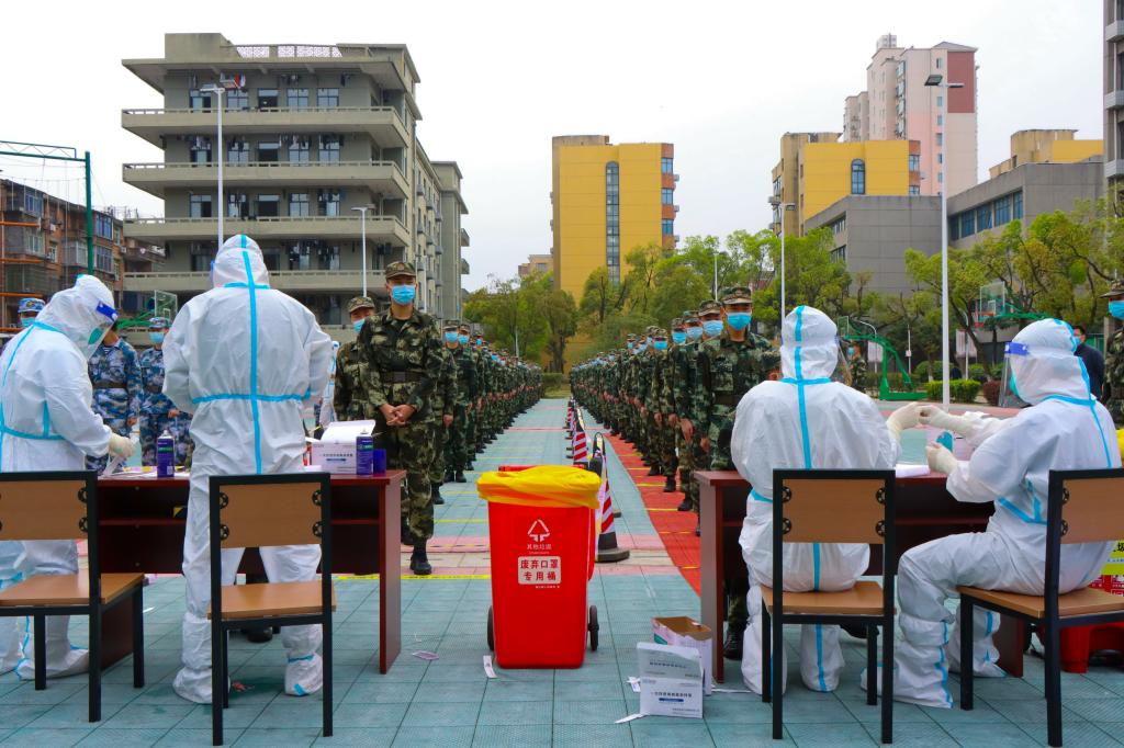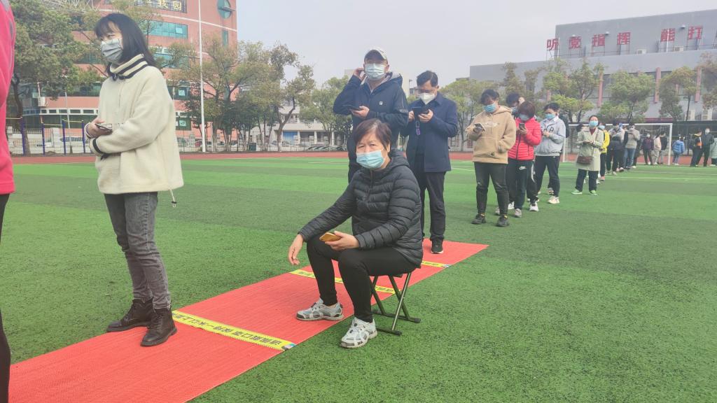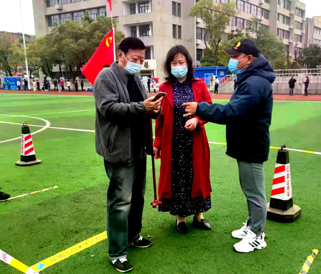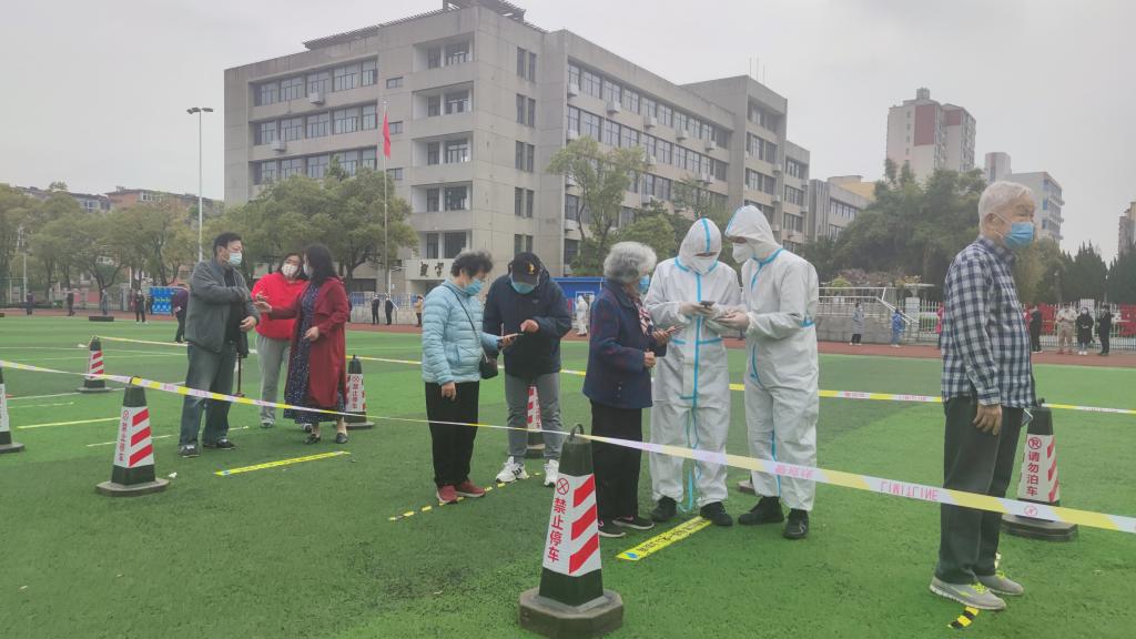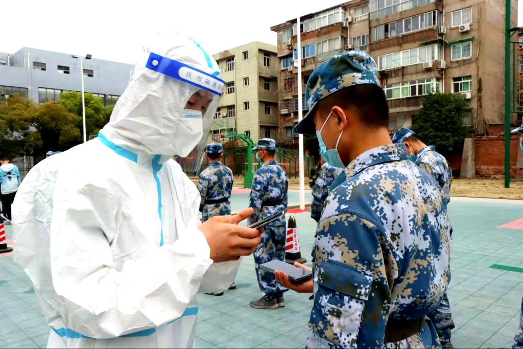 在检测区域,活跃着这样一群“红马甲”,他们是由教职工、士官学院学生组成的志愿服务队伍。在检测现场,他们耐心地引导受检群众按防护要求佩戴好口罩、保持一米距离等候采样;有些群众不会调出昌通码,他们耐心指导,为其提供必要的帮助;采样队伍中有等候的老人,他们会迅速为老人送上小马扎,搀扶老人进行提前采样。“虽然不能像医生一样奋战在前线,但我们还要贡献自己一份力量”志愿者们说。志愿者们用忠诚和勇气书写初心和使命,用实际行动诠释了责任与担当。