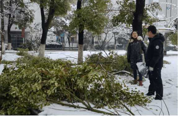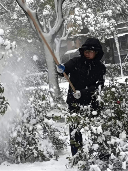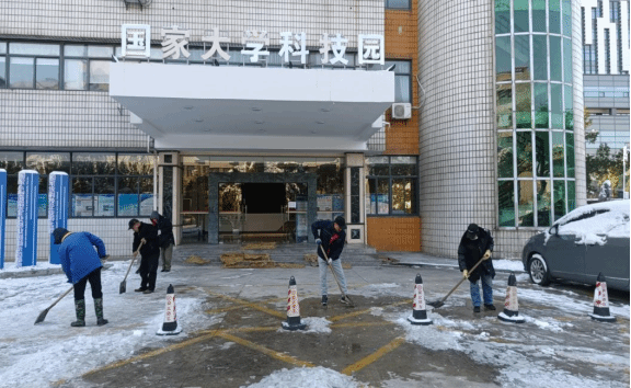 清晨7点,大家分工有序,团结合作,检查校园积雪和安全状况、校园水管等设施设备情况,清扫校园主路、居民区门口和办公区域台阶积雪、铺上防滑草垫,清理断裂树枝等,保障了校园道路安全畅通。(文/赵冬梅 图/王锐)